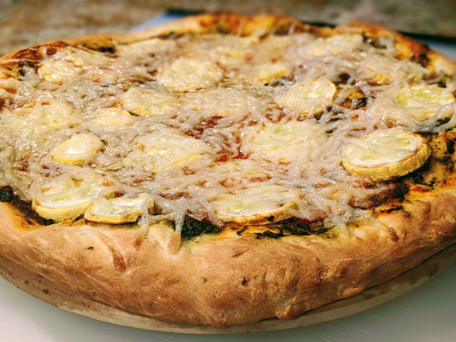 We spread our homemade pesto sauce on the dough, along with some dollops of tomato sauce. We chopped up 2 cloves of fresh garlic and spread it out over the top of the sauce. We then cut the squash into 1/8 in thick rounds and placed them on the pizza as if they were slices of pepperoni. We then sprinkled about 2 cups of shredded mozzarella on top and put in into a 450deg F oven for about 15 min.